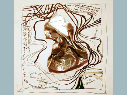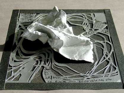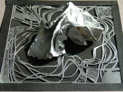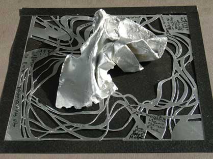 This sculptural study's approach is based and inspired by the following fact as witnessed and recorded in the book "Chaidari" by the doctor of the camp Antonis Flountzis.The detainees on their way to Kaisariani, where their imminent execution would take place, seeking ways to communicate with their loved ones in their this last hour, they threw from the truck that transported them, a lot of notes, on small papers or written in pieces of cloth (since paper was prohibited), on hankerchiefs, clothes and in a case somebody on his wooden leg...