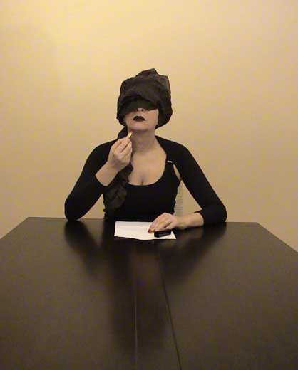 At this point, eyes and head still covered, I presented a small mirror and red lipstick. I opened the mirror, and advanced the lipstick. I colored my lips twice.