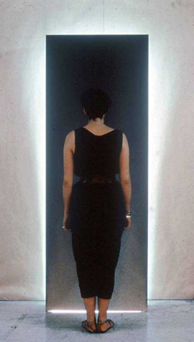 This piece, standing as an object in real space while, at the same time, creating the impression of an opening, a door, functions as an abstract "mirror" where one projects oneself hence the title Tauton (tautology).
