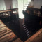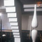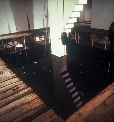 The gradient structure, adjusted around the column of the Gallery, is recognized-in its reflection on the burnt engine oil- as a flight of stairs. However being only a reflection, this staircase as well as the illusion of the subterranean room is inaccessible.