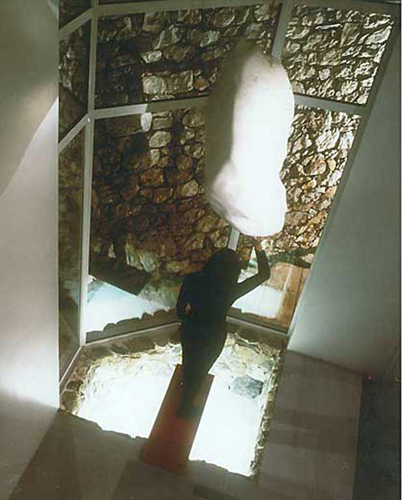 At the corner of the house-which was a glass enclosed trapezoid area originally intended for planting-I hung a 250 Kgr. rock by a thin metal chord of 6 mm through a ball bearing.