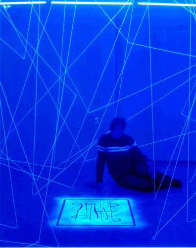 It is created by one line (cotton string) that weaves(either sparsely or densely) through space. The piece, at first, might seem impenetrable and yet it can be penetrated by simply walking through it.